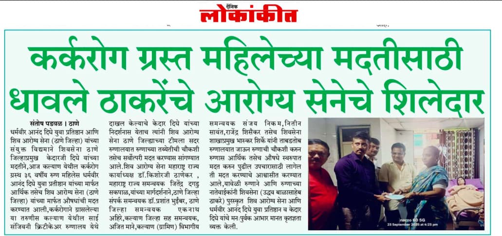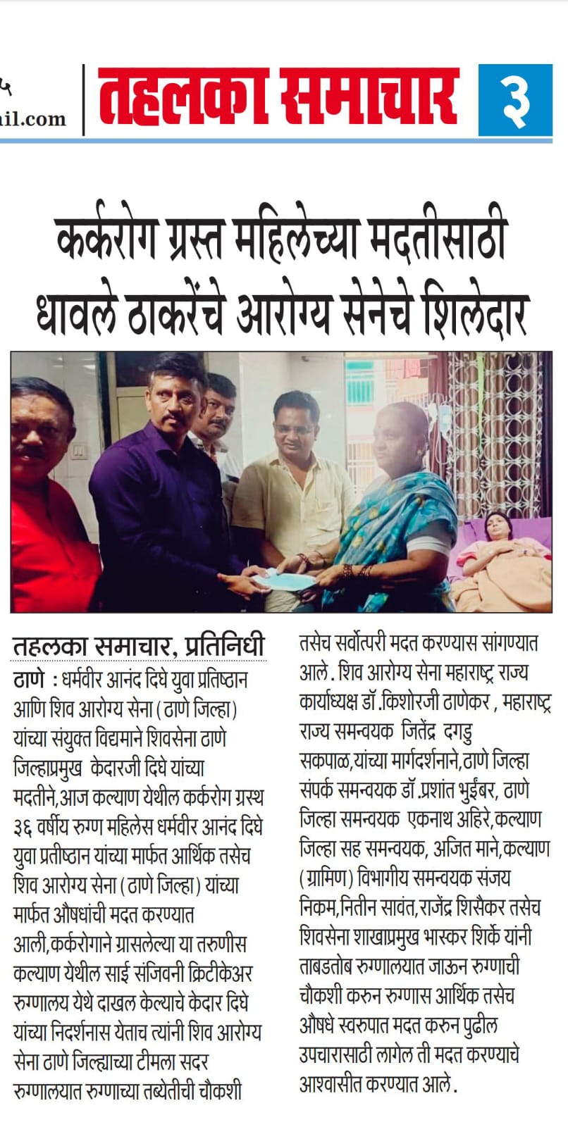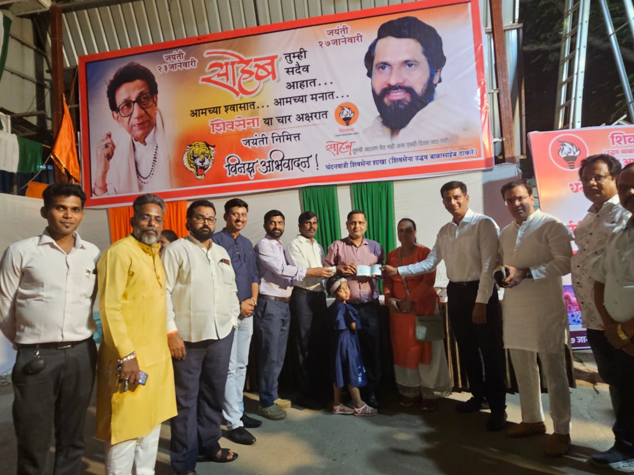 गुरुवर्य धर्मवीर आनंद दिघे साहेबांच्या जयंती दिना निम्मीत्त शिवसेना (उद्धव बाळासाहेब ठाकरे) पुरस्कृत शिव आरोग्य सेना (ठाणे जिल्हा) आणि धर्मवीर आनंद दिघे युवा प्रतिष्ठान यांच्या संयुक्त विद्यमाने आणि सन्माननीय शिवसेना ठाणे जिल्हाप्रमुख श्री केदारजी दिघे साहेबांच्या संकल्पनेतून कॅन्सरग्रस्त रुग्ण तसेच डायलेसीस रुग्ण यांचे करीता मोफत औषधे वाटप त्याचप्रमाणे श्रवण यंञ बसविण्याकरीता निधी वाटपाचा कार्यक्रम आज चंदनवाडी शिवसेना शाखा येथे आयोजित करण्यात आला.