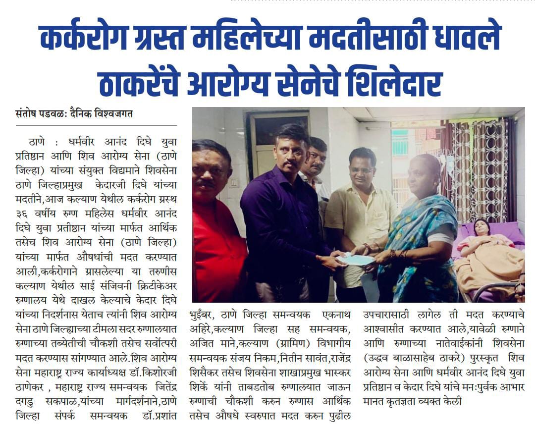 या कार्यक्रमात ५०,०००/- पर्यंत औषधे वाटप आणि श्रवण यंत्रासाठी ५०,०००/- रुपयांची मदत करण्यांत आली. श्रीमती लक्ष्मीबाई शिवाजी गायकवाड,श्रीमती सविता कृष्णा शेटकर,सौ.दिपाली अनिल मोरे,श्री श्रीनाथ शंकर गुप्ता,श्री दिनेश रतीवाडकर या सर्व रूग्णांच्या नातेवाईकांनी तसेच सौरवी सुरेश पंडा या ४ वर्षीय श्नवण यंत्र बसविण्यात येणाऱ्या मुलीच्या आई वडिलांनी देखील शिवसेना, शिव आरोग्य सेना आणि धर्मवीर आनंद दिघे युवा प्रतिष्ठान व श्री केदार दिघे साहेबांचे मनःपुर्वक आभार मानले….!