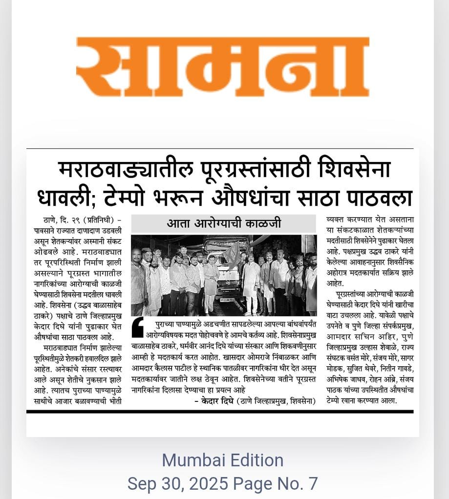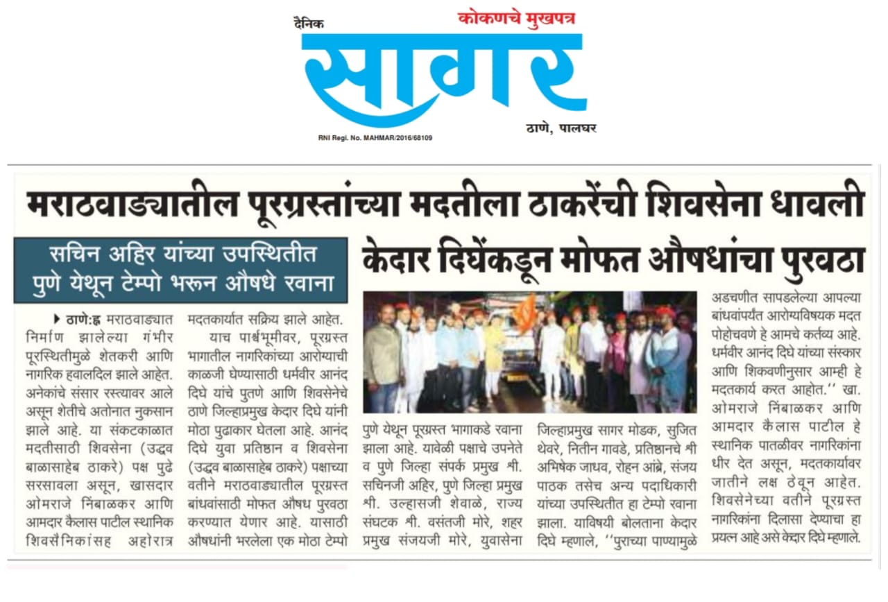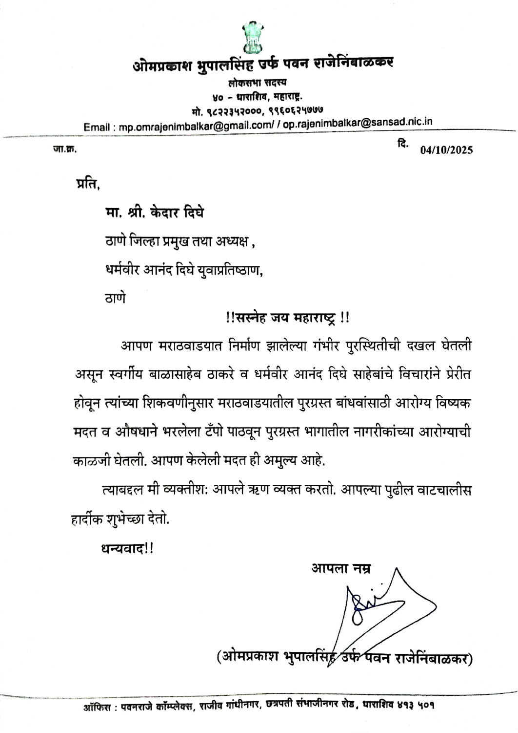 याच पार्श्वभूमीवर, पूरग्रस्त भागातील नागरिकांच्या आरोग्याची काळजी घेण्यासाठी धर्मवीर आनंद दिघे यांचे पुतणे आणि शिवसेनेचे ठाणे जिल्हाप्रमुख केदार दिघे यांनी मोठा पुढाकार घेतला आहे. आनंद दिघे युवा प्रतिष्ठान व शिवसेना (उद्धव बाळासाहेब ठाकरे) पक्षाच्या वतीने मराठवाड्यातील पूरग्रस्त बांधवांसाठी मोफत औषध पुरवठा करण्यात येणार आहे.