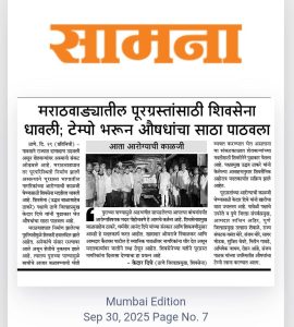 ठाणे:– मराठवाड्यात निर्माण झालेल्या गंभीर पूरस्थितीमुळे शेतकरी आणि नागरिक हवालदिल झाले आहेत. अनेकांचे संसार रस्त्यावर आले असून शेतीचे अतोनात नुकसान झाले आहे. या संकटकाळात मदतीसाठी शिवसेना (उद्धव बाळासाहेब ठाकरे) पक्ष पुढे सरसावला असून, खासदार ओमराजे निंबाळकर आणि आमदार कैलास पाटील स्थानिक शिवसैनिकांसह अहोरात्र मदतकार्यात सक्रिय झाले आहेत.